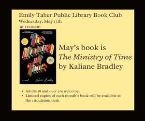 Join us for Book Club at Emily Taber Public Library on Wednesday, May 13th at 11 AM. Adults 18 and over are welcome and limited copies are available at the circulation desk. Be sure to call ahead of time to be sure a book is available.